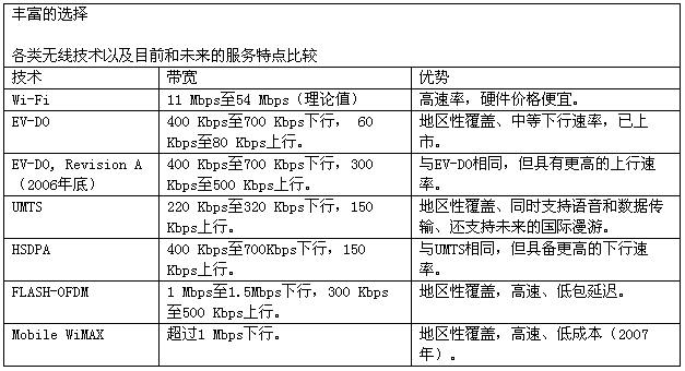 以前,當(dāng)某位員工要出差時(shí),公司只要給他一部蜂窩手機(jī)和一臺用于撥號接入數(shù)據(jù)網(wǎng)絡(luò)的筆記本電腦即可。但是,這種日子已經(jīng)一去不復(fù)返了。今天的無線市場中充滿了各種新興的選擇,并且無論從功能還是特性方面都有很大的提升。雖然所有這些主要技術(shù)都支持無線通信,但用戶需要考慮并做出決定的東西也更多,如設(shè)備、運(yùn)營商、性能和覆蓋范圍等。